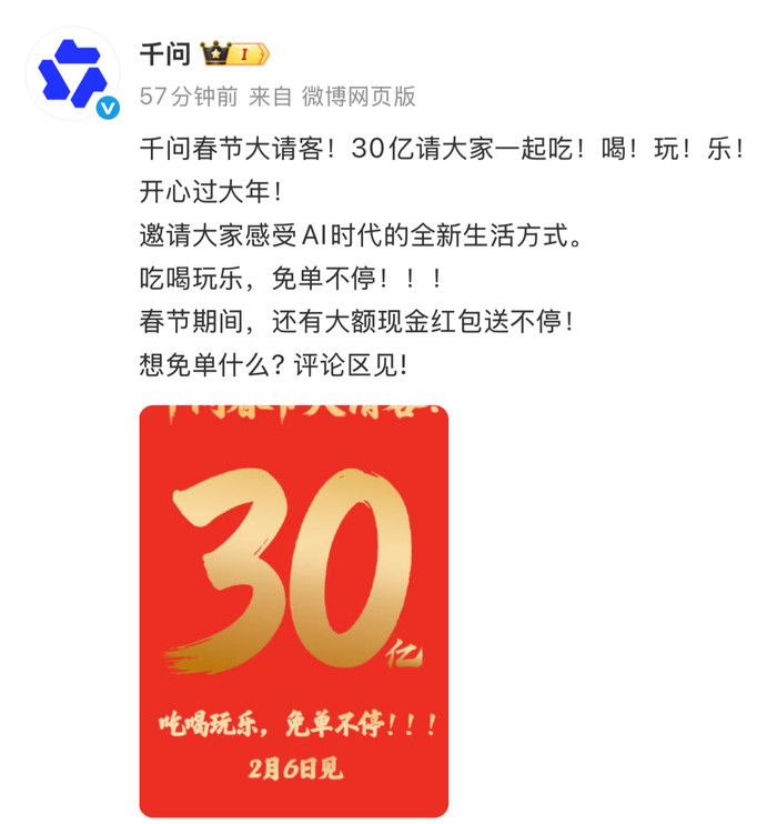 就在腾讯红包试探出社交裂变的极限时,阿里的30亿入局,选了一条截然不同的路。与直接对标现金补贴不同,通义千问此次“春节请客计划”并未采用单一红包模式,而是联动淘宝闪购、飞猪、大麦、盒马、天猫超市、支付宝等多条核心业务线,主打“免单”与履约能力。