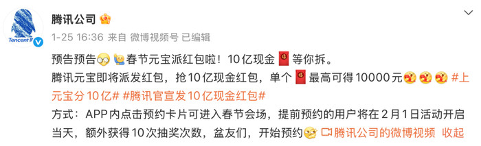从时间顺序看,腾讯是这轮春节AI补贴战中率先出手的一方。